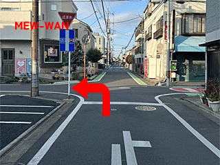 ↑右手が三河屋酒店さん、左手がMEW-EANです。お車でお越しの場合は、赤い矢印の方向へ左折してください。