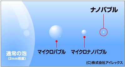 マイクロバブルとは、特殊な機械を使用して発生させる、気泡径が数十ミクロンの極小サイズの泡で(1ミクロン=1/1000mm)、泡がナノバブルに向かい小さくなればなるほど、肉眼ではより透明度が増してゆきます。