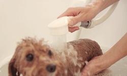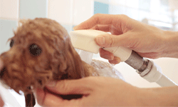 スタッフの手指がわんこの皮膚に全く触れることなく洗浄できるシャワーです。